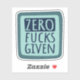 Let the world know exactly how you feel with this bold and unapologetic "Zero F*cks Given" design in a striking blue and teal shades. Perfect for anyone who's done dealing with nonsense and wants to share their no-fuss attitude with style. Featuring a casual, oversized typography style, this design makes a statement wherever it’s used—on t-shirts, mugs, tote bags, or posters. Ideal for those who embrace sarcasm, bold humour, and a carefree mindset. Whether you're shopping for yourself or looking for the perfect gift for someone with a sharp sense of humour, this design speaks volumes.
