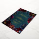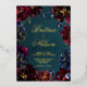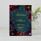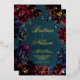 A red, green and blue jewel tone wedding invitation featuring a teal blue green, sapphire blue and a Bordeaux burgundy with raspberry pink highlights in a symphony of deep jewel tones adorned with real gold foil text with shimmering gold spray and outlines on a deep teal watercolor wash background with your names in a gold foil rustic wedding script with a small modern uppercase non serif font announcing your details.