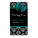 Lovely wedding mini wine labels ready for you to personalise with your own information. Chic black and white damask pattern, on the top and bottom of the label, with a teal bow, at the top, and a teal band, at the bottom of the label, with a black text area, in the middle. Text is fully customisable to suit your wedding needs. Great for your wedding reception table or gift wines.