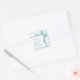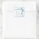 This bridal shower square sticker features a design that looks like an elegant gift. The background is dusty teal coloured with a white dot pattern and the sticker has a graphic of a dusty teal ribbon tied into a bow. The centre of the sticker is white and features customisable text for the bride's name and shower date.