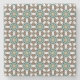 A patterned coaster with a glass of water and lemon slice rests on a gray surface. The coaster has a geometric design in teal, brown, and white.