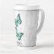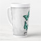 Enjoy your latte or morning coffee with a Teal Butterfly Floral Personalised Latte Mug. Mug design features a pair of vibrant butterflies resting on a white floral vine against a light grey grunge background. Additional gift items available with this design as well as a variety of colours.