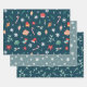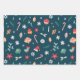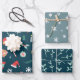 This Christmas design wrapping paper sheet set will make a pretty coordinated gift set. The first sheet has a cute pattern of Christmas images, including candy canes, Santa hat, tree bulbs, stockings, snowflakes and green twigs. The colourful images are placed on a dark Holiday teal green background. The second sheet has a pattern of matching white snowflake images on a medium teal grey background. The third sheet has a pattern of light teal Holiday twigs on the darker teal background. All together or separately, they make a nice gift package.