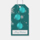 Tag your Christmas gifts for their recipients this holiday season with a Teal Christmas Ornaments Gift Tag. Gift tag design features a trio of hanging Christmas ornaments with falling snowflakes and a dark teal background. Additional gift and holiday items available with this design as well.