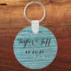 Teal coloured rustic wood keychain. Customise the text for your names and special date. Make finding lost keys easier with your name or names on it! Play it straight, or make it fun. "Walking the plank with Taylor & Jeff" would make a great wedding favour.