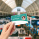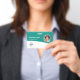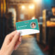 Personalise these horizontal teal turquoise employee badges with an employee photo, company logo, bar code, employee id and name.