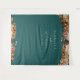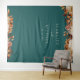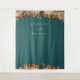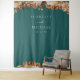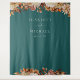 Teal Fall Leaves Tapestry. Transform your venue with this breathtaking tapestry that doubles as a photo backdrop, ceremony accent, or décor focal point. The rich teal background is layered with hand-painted fall leaves in terracotta and burnt orange, alongside beige dahlias and copper-hued roses, creating a soft yet dramatic autumn scene. Whether hung behind your sweetheart table or near the dance floor, it’s a stunning way to enhance your space. Customise yours and make a statement with every detail.