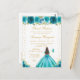 This elegant and glamourous sweet sixteen birthday invitation features a beautiful princess with brunette hair and fair skin in a teal blue ball gown. The text combines handwritten script and modern sans serif fonts for a classy and sophisticated look. The floral arrangements, butterflies and gold confetti create the perfect blend of rustic and chic.