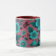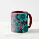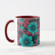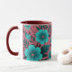 A vibrant floral pattern featuring large, teal-coloured flowers and lush green leaves arranged artistically on a rich maroon background. The design includes various leaf shapes and smaller flowers, adding depth and contrast to the overall composition. This design is ideal for use in textiles, wallpapers, or digital art projects seeking a balance of bold colours and natural elements.