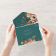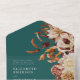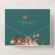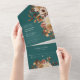 Teal Floral Wedding All in One Invitation. Simplify your wedding stationery with this all-in-one invitation and RSVP card, combining convenience with a touch of seasonal charm. Folded into a cohesive format, this design features rich teal tones and hand-painted fall florals—burnt orange and terracotta leaves, beige dahlias, and copper-hued roses—on both the front and interior. Guests can easily tear off the RSVP section and return it, while the design ensures that every detail reflects your autumn theme. Personalise it for a beautiful, streamlined experience from start to finish.