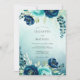 This design features a lush array of watercolor blooms in shades of teal and navy blue. Delicate roses and cascading floral accents create a romantic and sophisticated aesthetic. A soft aqua wash provides a serene background, complemented by golden-toned leaves. This artistic arrangement captures the essence of a vibrant seasonal event with its rich palette.