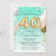This 40th birthday party invitation features a glamourous teal and gold theme. The "40" is printed in gold foil balloons, with party balloons placed on either side. The background features a gradient design with a teal glitter marble pattern in the top portion.