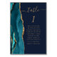 The left-hand edge of this elegant modern wedding table number card features a teal watercolor agate border trimmed with faux gold glitter. The word "table" appears in gold-coloured handwriting script on a navy blue background. Add the names of your guests who are assigned to each table.