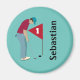 Blue personalised golfer, wearing a cap, deep red shirt and blue pants, putting a golf ball into a hole magnet. Customise the text.