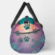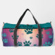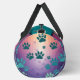 This colourful pattern duffel bag showcases a captivating teal and blue gradient background adorned with multiple shades of coloured paw prints. It's a stylish and versatile travel gear piece, ideal for any pet lover.