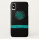 Teal Green Celtic Knot iPhone X Case. A black case for your iPhone X with a green sash Celtic knot. Fill in your name at the prompt to personalise and customise any way you like. Celtic knots are an ancient Celtic traditional art form usually chraacterised by having no beginning and no end. They symbolise eternal love and the never-ending cycle of life. They have been found to be a favourite symbol in many varied cultures and civilisations, and with many practitioners of magic or mysticism today. This four-sided shield knot represents protection. A perfect symbol on a case custom made to protect your most precious device.