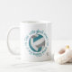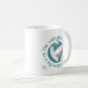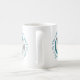 This sporty volleyball team colours coffee mug with monogram features the typographic phrase, "The volleyball court is my happy place" and two heart outlines in teal encircling a volleyball with teal, grey and white coloured panels - customise with monogram - by katz_d_zynes