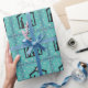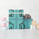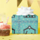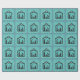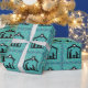 This design features the nativity with a silhouette of the holy family in the stable. Mary and Joseph look over baby Jesus in the manger. The background is a festive teal with swirls and stars surrounding the nativity.