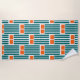 This beach towel has a mid-century modern design made of five teal lines and two orange rectangles repeated across the design.