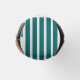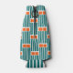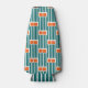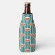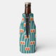 This bottle cooler has a mid-century modern design made of five teal lines and two orange rectangles repeated across the design.