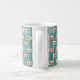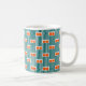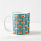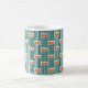 This mug has a mid-century modern design made of five teal lines and two orange rectangles repeated across the design.
