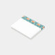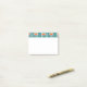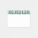 This Post-It notepad has a mid-century modern design made of five teal lines and two orange rectangles repeated across the design.