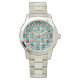 This women's watch has a mid-century modern design made of five teal lines and two orange rectangles repeated across the design.
