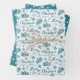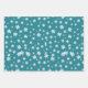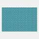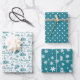 Here's a pretty teal green and white Holiday series of wrapping paper. One paper has a pattern of teal mittens with matching snowflakes on a white background. The script "Merry Christmas" is between the mitten images. One has a white polkadot pattern on a matching teal background.The third paper has a pattern of white ornate snowflakes on the same teal background. All the colours coordinate beautifully together.