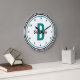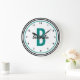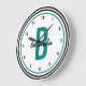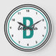 A bold, modern, personalised custom wall clock for men or women. Bold black and teal circles highlight a jumbo sized teal coloured monogram and casual handwriting font first name in black. Other colours, styles and designs available in the Party Hearty store.