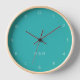 Simpe, stylish custom name wall clock in a modern minimlist style in cyan teal turquoise blue. This can easily be personalised with the name or monogram of a loved one for a perfect one of a kind gift.