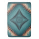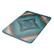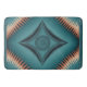 A symmetrical geometric pattern design in a square format with a teal and copper colour scheme. The centre features a large diamond-shaped medallion with intricate line work and a circular sunburst pattern inside. The medallion is surrounded by four smaller diamond-shaped frames with ornate border patterns. The background has a radiating sunburst effect emanating from the centre, creating a dynamic sense of movement. The outer border consists of jagged, sawtooth-like spikes in copper tones against the teal background. The entire design is enclosed by a thin dotted line border. The colour palette transitions from deep teal in the centre to lighter turquoise tones near the edges, with copper accents in the spikes and decorative elements. The pattern has a Native American or Southwestern design influence with its geometric shapes and radiating motifs.