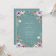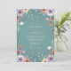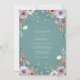 This design features a serene muted teal background adorned with soft watercolor botanical elements. Delicate lavender roses and peach blossoms create a romantic arrangement across the composition. Ethereal greenery and wispy leaves add a touch of nature-inspired elegance. The palette combines deep seafoam tones with warm pastel accents.