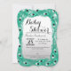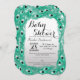 Elegant teal peacock feathers on white to grey gradient Baby Shower invitations. Very classic and sophisticated design for the mum to be. Personalise with your own message and monogram on the back. All photo print design.