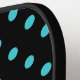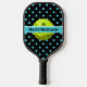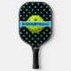You'll stand out on the Pickleball court with this custom-designed pickleball paddle with a turquoise blue polka dot pattern on a black background with a teal blue and white trimmed band across the centre that has customisable wording on both sides. The front says, "Pickleball Princess" and the back is personalised with your name and there is an image of a green pickleball behind the blue band. Email niteowlstudio@gmail.com with any request for changes.