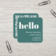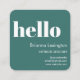 Customisable teal business card, with HELLO typography and name, profession, website and social media details. On the back there is a scannable QR code. To generate a new QR code on the design that links to your own website, click on the "personalise this template" Add your URL address or social media handle in the area provided and a QR code will be generated just for you.
