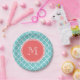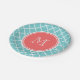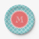 Teal Quatrefoil Pattern, Coral Monogram Paper Plate