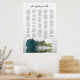 This gorgeous wedding seating chart features a photo of a long-stemmed teal, turquoise, or dark aqua coloured rose lying on its side reflecting in a pool of water with waves and ripples. The title reads "please find your table" in elegant lacy script calligraphy. There is space for the up to 250 names with the names of the couple and wedding date below. Wonderful way to help your guests find their tables while making your reception more beautiful.