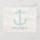 Perfect for a nautical themed wedding is this Rustic Anchor Wedding Table Number Postcard with a teal boat anchor on a light beige marble look background. This classic and simple table card is easy to customise with your wedding details. Find more personalisation options by clicking Customise.