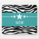Trendy and modern Sassy Star Zebra Mousepad featuring a chic black and white zebra print background and a bold turquoise border adorned with a fun star motif. This girly design may be customised with the personalised text of your choosing. Click "Customise It" to find more personalisation options.