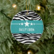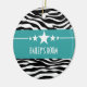 Trendy and modern Sassy Star Zebra Ornament featuring a chic black and white zebra print background and a bold turquoise border adorned with a fun star motif. This girly design may be customised with the personalised text of your choosing. Click "Customise It" to find more personalisation options.
