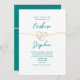 Simple, elegant calligraphy script, minimalist teal and white wedding invitation with romantic gold rope heart and full names - monogram back.