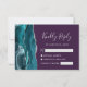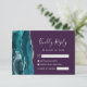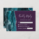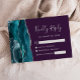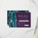 The left-hand edge of this elegant modern wedding RSVP enclosure card features a teal blue watercolor agate border trimmed with faux silver glitter. The title "Kindly Reply" appears in handwriting script, with customisable text below in silver grey copperplate font on a purple background. The reverse side features a matching teal blue and silver agate design.