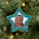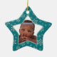 The front of this festive star shaped holiday ornament has your photograph framed in a pretty teal green and silver glittery stars pattern. The other side of the ornament holds your customised text in matching teal on a white star that is bordered with the same pretty stars pattern. It's easy to replace the sample photo with your own; use customise to move your photo into the best position for the star shape. *Please note - the image is printed and does not contain actual glitter.*