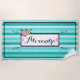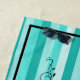 This gorgeous beach towel features a background pattern or teal stripes in four different shades of teal. The border of the towel has a rectangular black frame which matches the monogram box in the centre. The monogram box has a white background and features the sample name "Alexandra" printed in an elegant black font with the initial, or first letter of the name, enlarged.