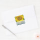 Square stickers to use as return address labels or envelope seals. Big yellow sunflower image over a dark teal blue / green background colour.