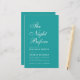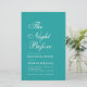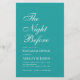 A simple, minimalist teal rehearsal dinner invitation. It has just white text on teal background. The title "The Night Before" is written in elegant calligraphy, the occasion "Rehearsal Dinner" and the name are written in larger caps, the rest in small caps. The text is left aligned.