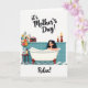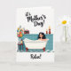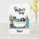 This card features a calm bathroom scene where a woman with dark, shiny hair reclines in a white clawfoot tub piled high with soft white bubbles, her gentle smile suggesting a quiet, caring moment ❤️. Teal-blue square tiles line the wall behind her, and the floor shows a matching teal-and-white checkerboard pattern that feels tidy and soothing. On the left, a small side table holds a clear glass vase of fresh flowers in orange, yellow, and light blue, next to a slim bottle of red drink and a single waiting glass, like someone set it there for her. Above that, a small retro-style music player sits nearby, adding to the cozy, unwind-together mood. On the right, two candles in decorative holders of different heights glow warm gold, casting a soft light that makes the scene feel tender and looked-after 🌼. At the top, the phrase “it’s Mother’s Day!” appears in flowing cursive-style lettering in a dark tone against the light background. Near the bottom, the word “Relax!” is placed clearly in a matching dark color, and the tub’s curved feet stand out against the patterned floor.