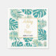 Teal and gold tropical leaves wedding paper napkin. The focus of this outstanding design is the leaves of Split Leaf Philodendron (Monstera deliciosa) or Swiss Cheese Plant and palm leaves in teal blue with gold outline. A white frame with gold outline holds your text.