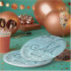 Wedding reception decor. Teal turquoise green floral monogram pattern custom paper plates. Classy, chic, elegant, modern, trendy, stylish, beautiful succulent metallic. To change the typography, click on edit design. Image copyright Marg Seregelyi Photography.