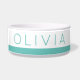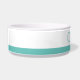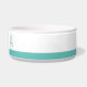 Turquoise blue-green bright teal personalised pet bowl for your dog or cat's food or water with a simple, minimalist, and modern stripe and thin font letters will look great in any room.